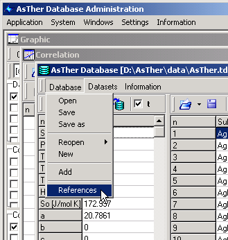 The application "Database Administration" (\AsTher\bin\DBAdmin.exe) can be used to view and modify the file \AsTher\data}AsTher.ref . Menu [Database]->[References] The file can also be edited with any text