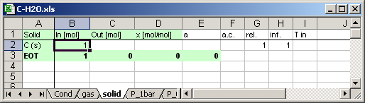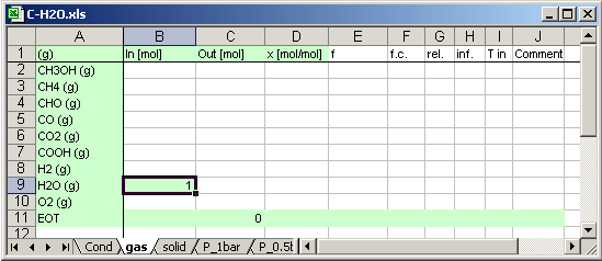 Cell [B9] contains input value for H2O (g) 1 [mol].