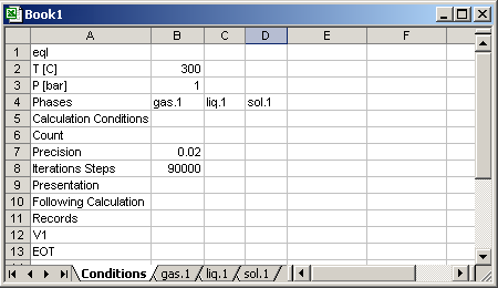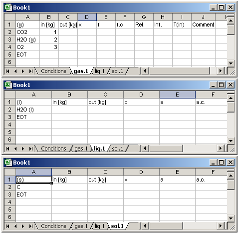 Book1 contains a conditions sheet and three phases gas, liquid and solid.